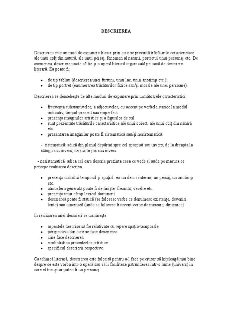 Descrierea este un mod fundamental de expunere al operei literare, o tehnică artistică, prin intermediul căreia sunt creionate trăsăturile particularizante ale unui personaj, fiind în acest caz, de tip portret, sau ale unui cadru natural, de tip tablou. Relația stabilită între personaj și cititor. Peisajul, tabloul, descrierile de interioare, portretul etc.