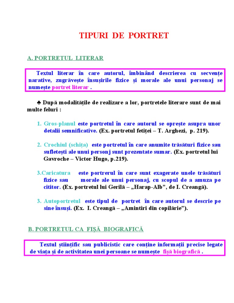 Care înfățișează figura unei persoane. Elementele de portret fizic și moral. Urmarind modul in care este realizat portretul, mai putem deosebi: