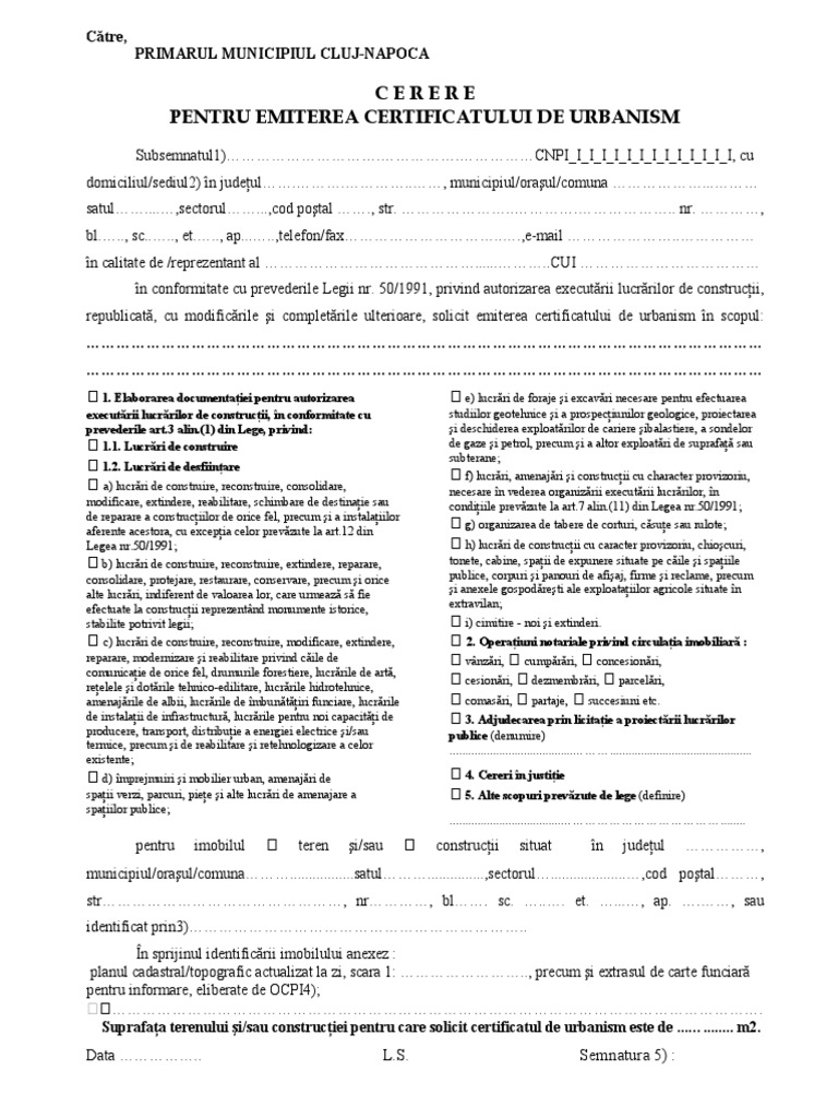 Precizri privind completarea formularului cerere pentru emiterea certificatului de urbanism. Acte necesareeliberării certificatelor de urbanism. Judetul cluj este singurul in care se implementeaza la ora actuala, cu bani europeni, un proiect de tipul smart territory, adica.