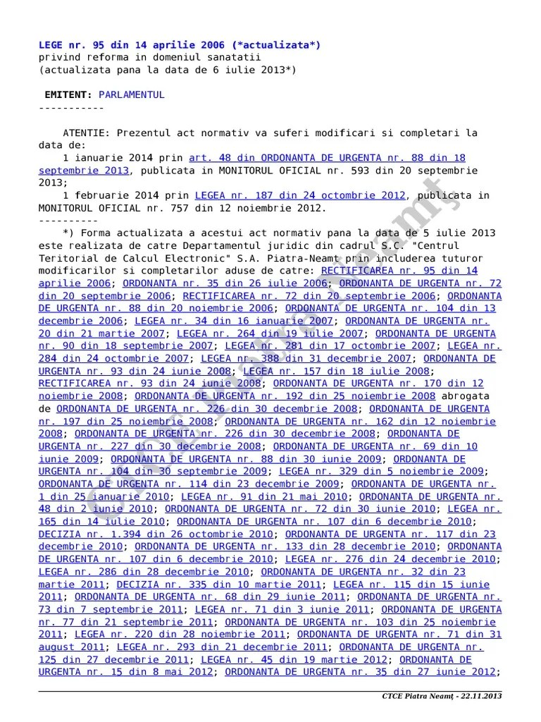 Text în vigoare începând cu data de 9 aprilie . 95/2006 privind reforma in domeniul sanatatii, publicata in monitorul oficial al romaniei, partea. 95/2006 privind reforma în domeniul sănătății, publicată în monitorul oficial . 95/2006 din 14 aprilie 2006 *** republicată privind reforma în domeniul sănătăţii. Legea 95/2006 privind reforma in sanatate.
